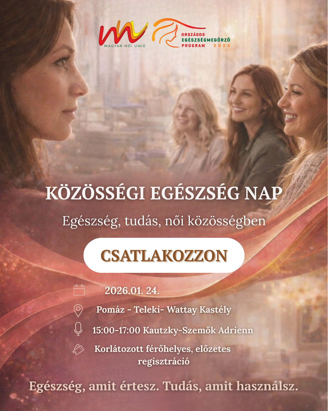 🌸 Tanuljunk együtt, kérdezzünk bátran, és vigyünk haza olyan tudást, ami a hétköznapokban is használható! Tudja mindenki, hogy az Ember legnagyobb kincse az egészsége! De biztos, hogy jól bánunk vele? El tudunk igazodni az információk áradatában? Jól tudjuk hasznosítani a kapott tanácsokat? Kihez forduljunk? Ezen dilemmák megválaszolásában segít a Magyar Női Unió 2026. évi Országos Egészségmegőrzési Programja. Célunk, hogy ismert és elismert szakértők bevonásával fokozzuk az egészségtudatosságot, elsősorban a nők körében. Friss tudással, hazai és nemzetközi jógyakorlatok bemutatásával, online és személyes előadásokkal, workshopokkal, konzultációkkal hiteles, közérthető és a mindennapi gyakorlatban alkalmazható egészségmegőrzési információkat kívánunk közvetíteni az érdeklődőknek. Hiszünk abban, hogy ha a nő testi, lelki és szellemi egészsége megerősödik, az pozitívan hat nemcsak saját, hanem az egész család egészségére! Az első Közösségi Egészség Napon Kautzky-Szemők Adrienn okleveles természetgyógyász, fitoterapeuta tart előadást korunk egyik kiemelten fontos, mindenkit érintő témájáról. 🎤