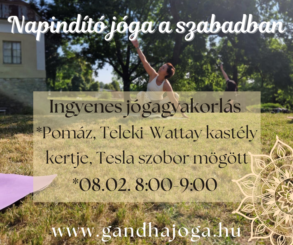 Ingyenes jóga a Tesla szobor mögött, a Teleki-Wattay Kastély kertjében.